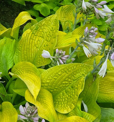 Прямостоячие,плотные, желтовато-зелёные, ярко-золотистые на солнце.Цветы лавандовые, растет в полутени и полной тени. Высота 35-40 см,нарастает медленно.