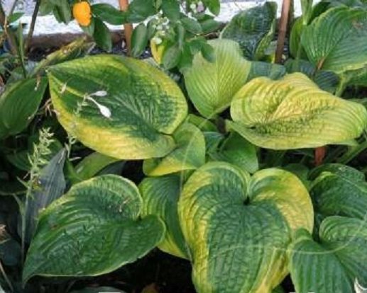 Гофрированные тёмно-зелёные листья с широкой зеленовато-жёлтой каймой.