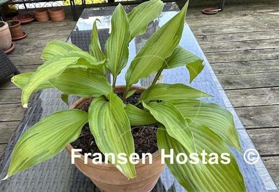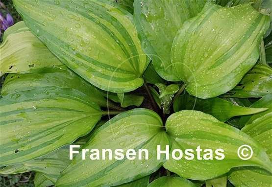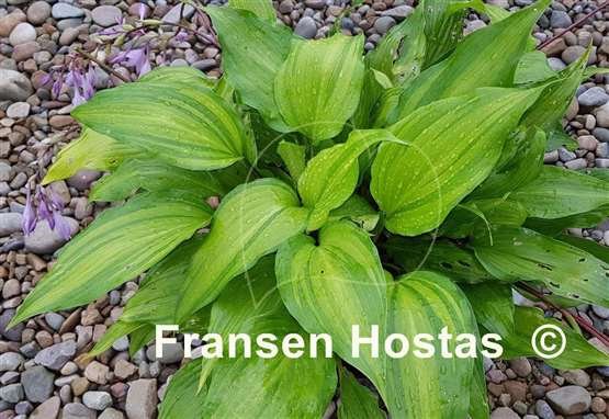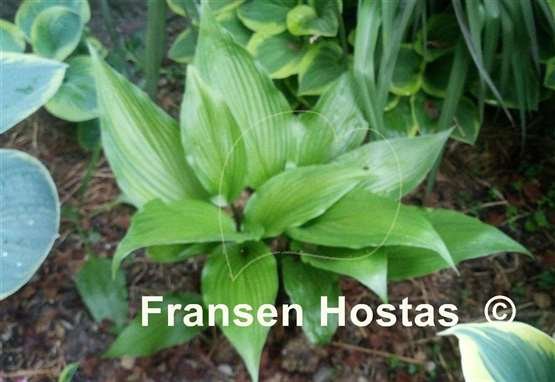 Удлинённые, изогнутые жёлтые листья с зелёными краями. Красные черешки. Цветы светло-лавандовые, растет в полутени и полной тени. Высота 30 - 35 см,нарастает средне.