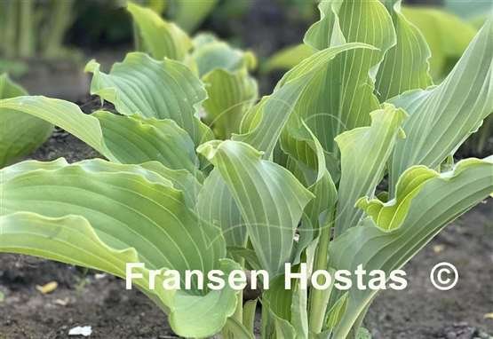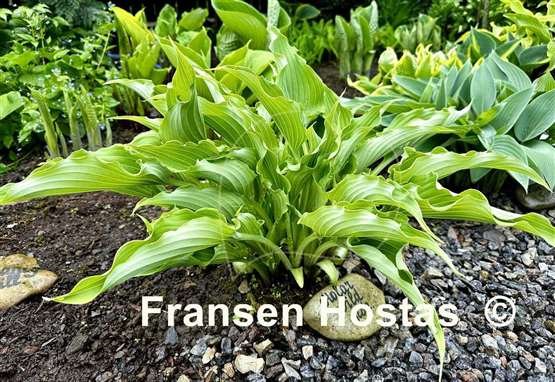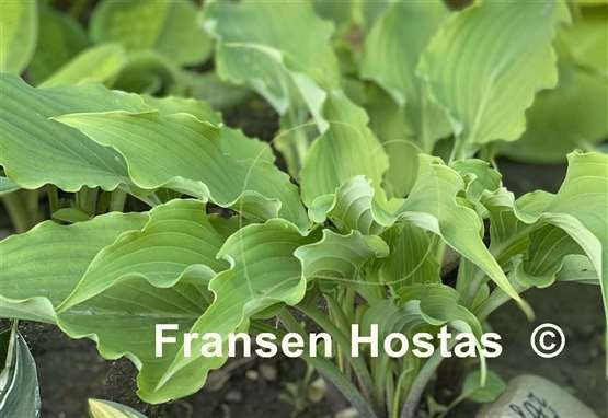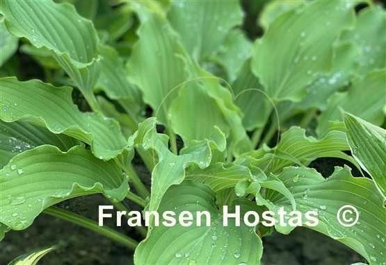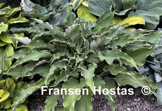 Скрученные темно-зеленые листья на длинных черешках, с волнами и оборками по краю.Цветы лавандовые, растет в полутени и полной тени. Высота 40-45 см,нарастает средне.