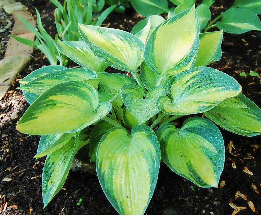 Листья желтые с зеленым краем.Цветы лавандовые, растет в полутени и полной тени. Высота 20 - 25 см,нарастает средне.