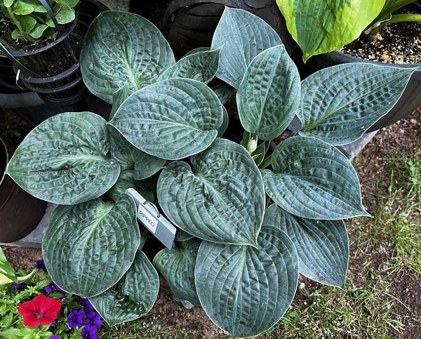 Листья плотные,жатые,округлые, расположены вертикально.На сизо-голубом фоне выделяются серебристые прожилки. Цветы лавандовые, растет в полутени и полной тени. Высота 35-40 см,нарастает средне.