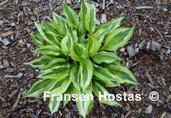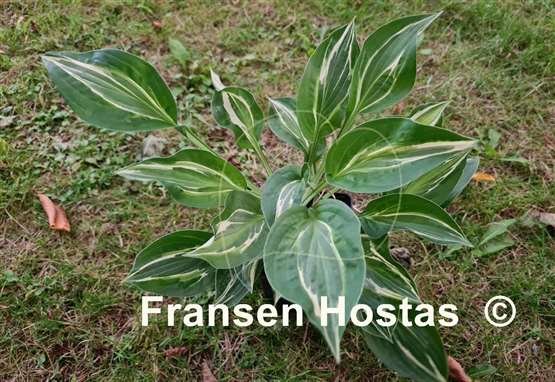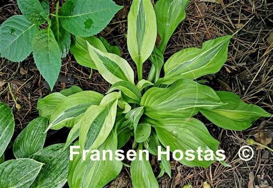 Зелёные листья, жёлтая кайма и широкая белая полоса в стиле «бикини в жёлтый горошек.Цветы лавандовые, растет в полутени и полной тени.Высота 35 - 40 см.нарастает быстро.